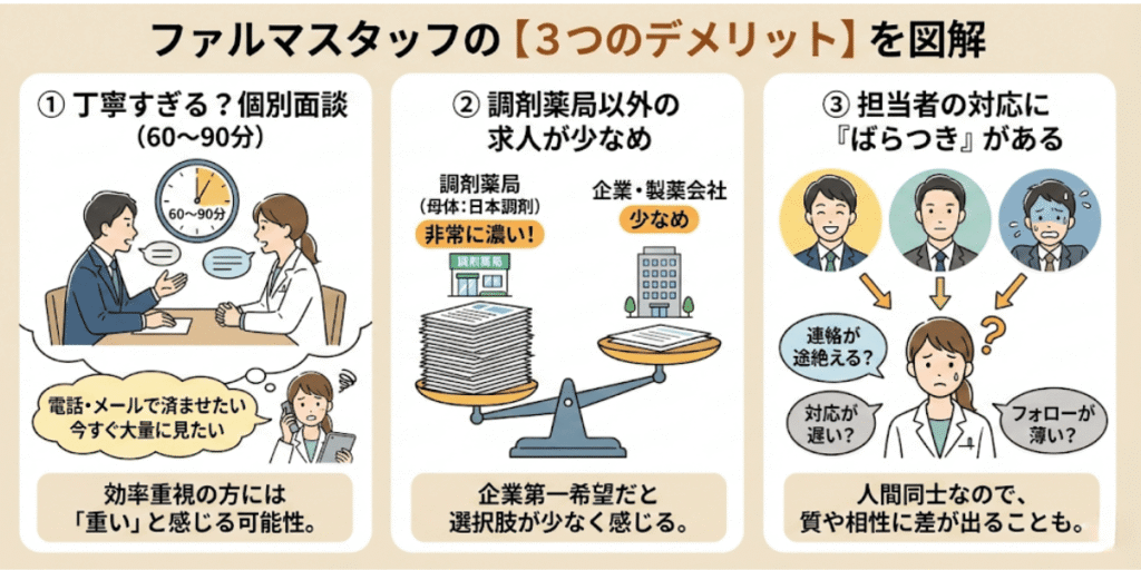 スマホで登録、相談して数日後には面接というスピード感を求める方には、この丁寧さが時間の無駄に感じてしまうかもしれません。